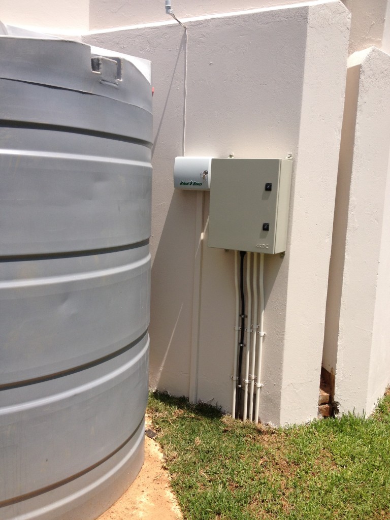 A 12 Station irrigation system was installed for Time-Place Projects Landscaping. A 111M deep borehole supplies 500L/hr to holding tanks which then supply a 50mm HDPE mainline.